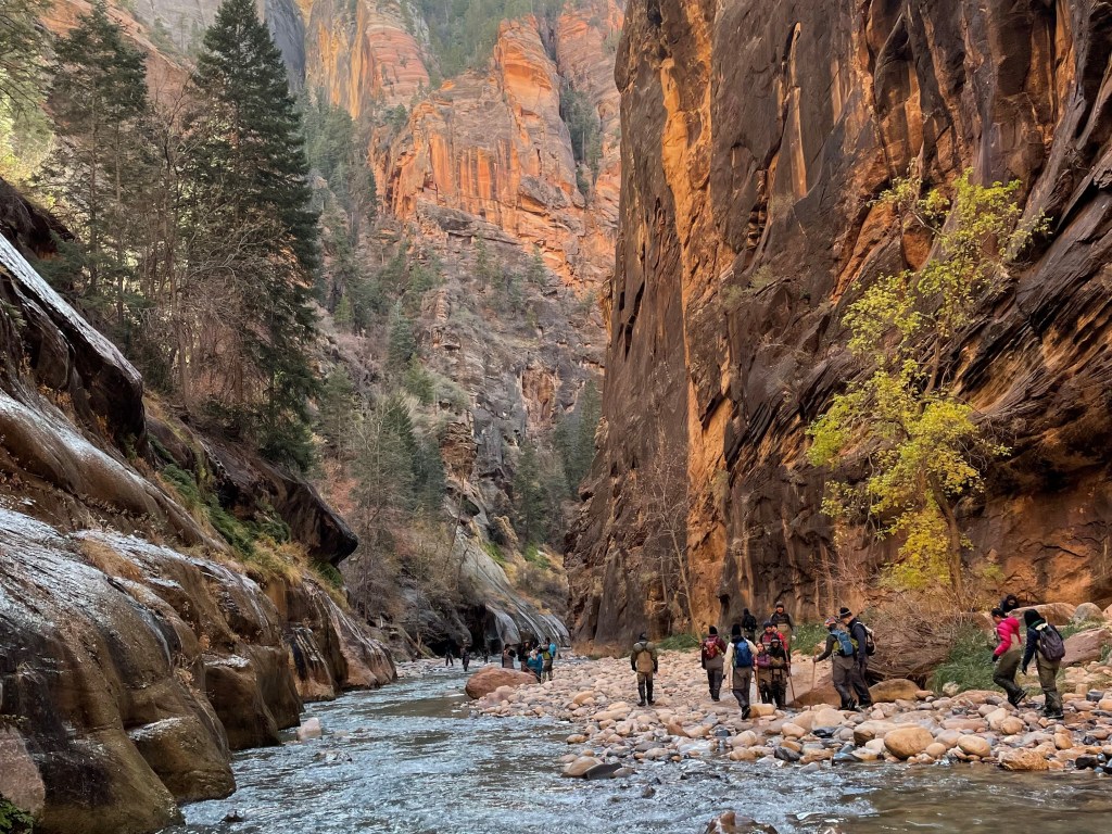 By 8 AM the next day we were already at the Zion Canyon Visitor Center parking lot. We arrived early to make sure we got parking spots and had plenty of time to hike The Narrows. After struggling to put on our dry bibs and river shoes, the eleven of us boarded the shuttle bus. “There is a 20% chance of rain at the Virgin River’s headwaters,” the friendly park ranger lady told us, “so move to the higher ground if you see the water rising!” Having seen the video of the raging flash flood in Zion last summer, we all kept this warning in mind.