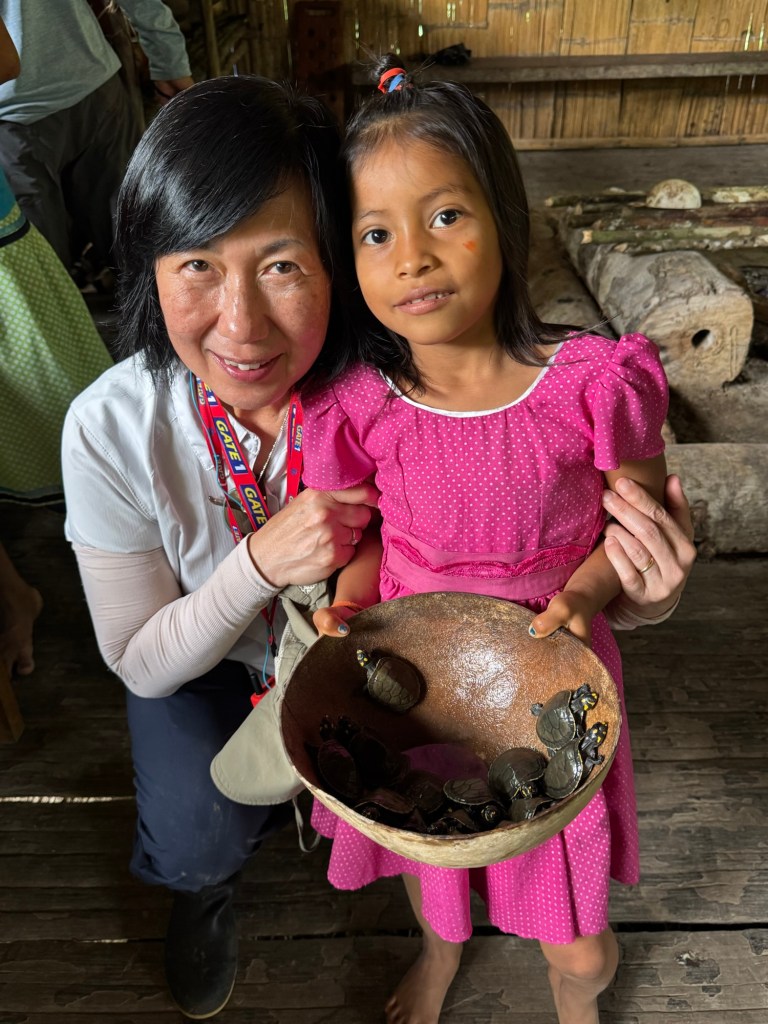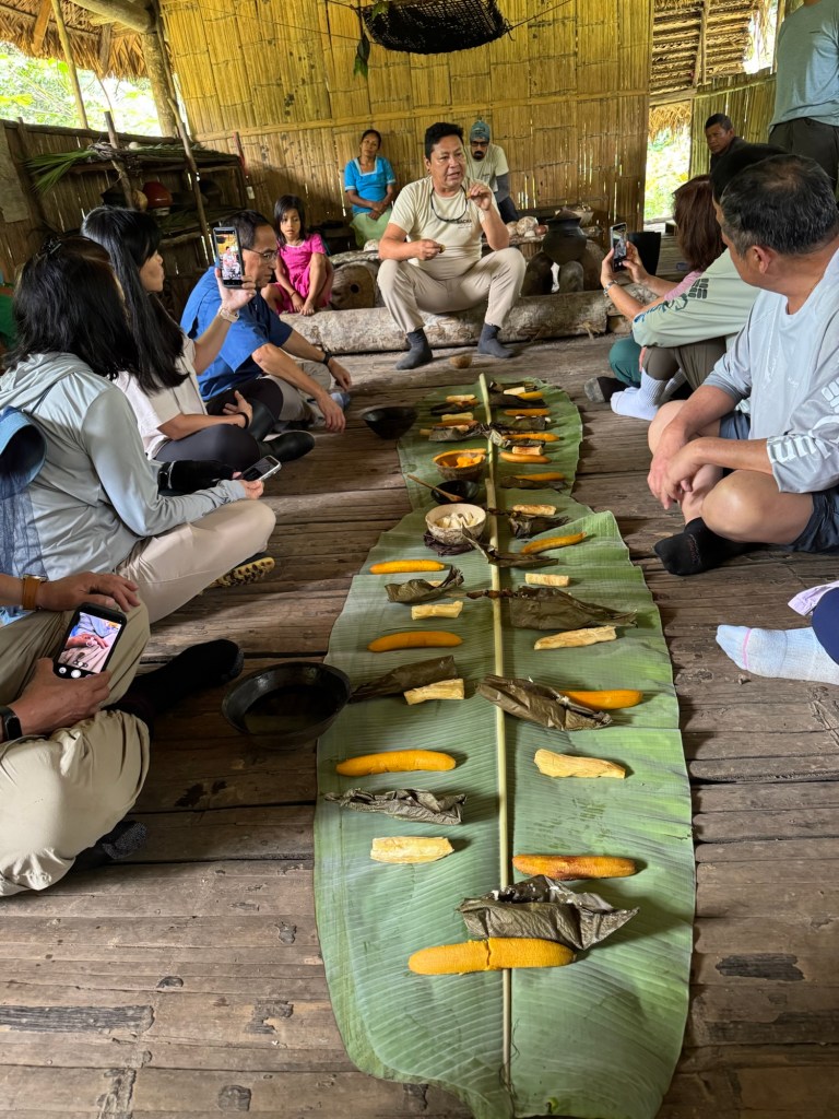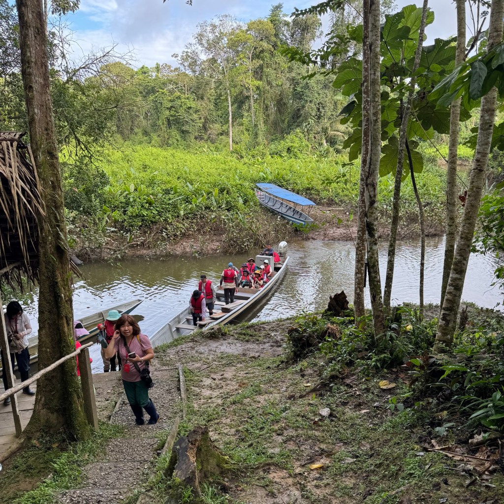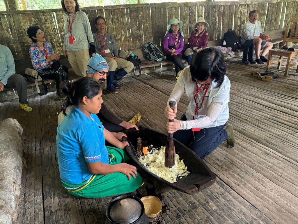 The phrase came up again on Day 10 when we visited the Nueva Providencia Interpretation Center to learn from local Kichwa women about their daily life in the Amazon (top picture). Javier and Alex, our local guide, explained that despite the hard work—collecting food daily from the farm (often with a child on their back), defending themselves with a machete from snakes and insects—life expectancy there is 80 years for men and 85 for women. Seeing our surprise, Javier told us, “Yes, their life is hard, but unlike us city people, they live day by day. They don’t worry about what will happen months or years from now.”